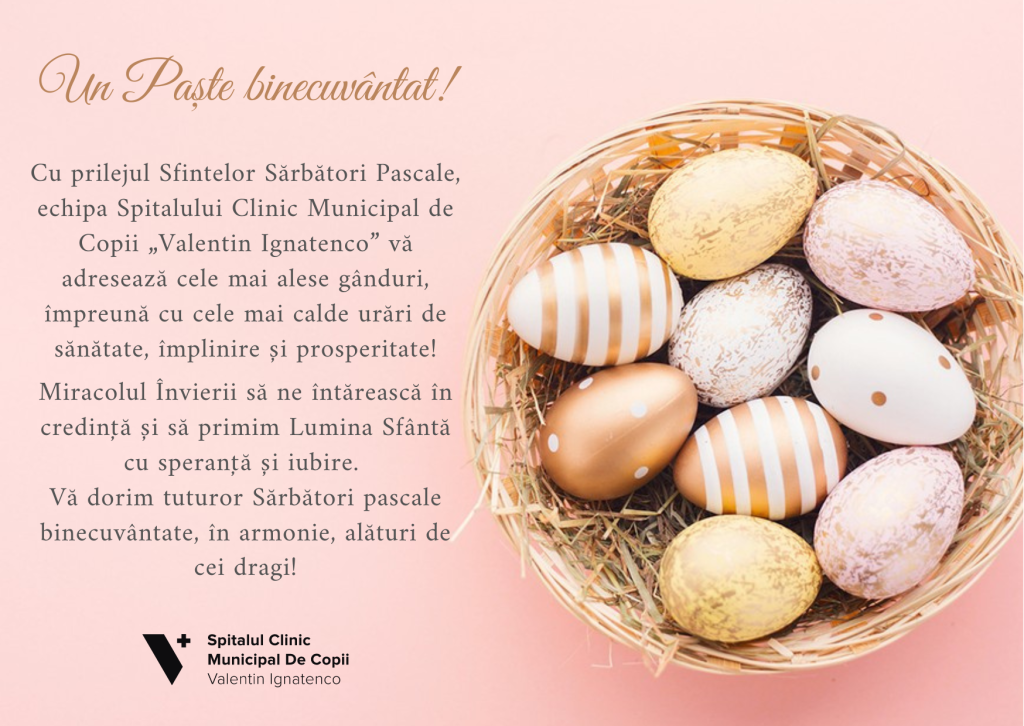 Cu prilejul Sfintelor Sărbători Pascale, echipa Spitalului Clinic Municipal de Copii „Valentin Ignatenco” vă adresează cele mai alese gânduri, împreună cu cele mai calde urări de sănătate, împlinire și prosperitate